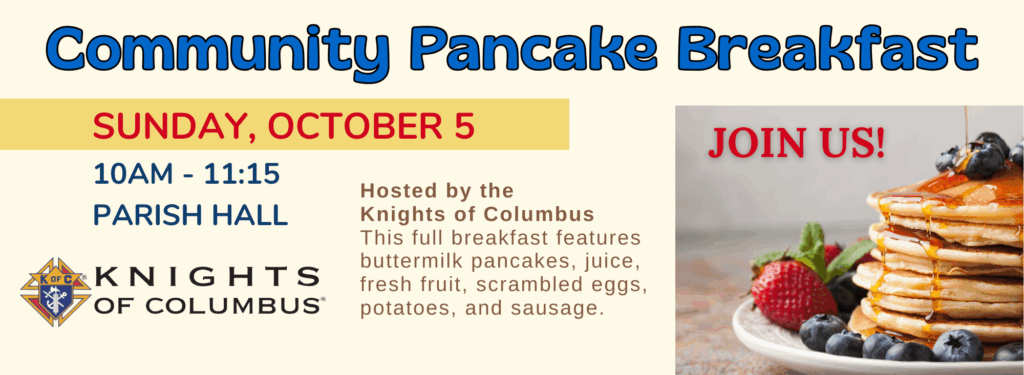 Blood Drive AND Pancake Breakfast October 5, 2025 St. James Parish Hall Blood Drive – 7:30am – 12:45pm Blood Bank Link to schedule Breakfast – Parish Hall doors open at 10:00 amHosted by the Knights of ColumbusThis full breakfast features buttermilk pancakes, juice, fresh fruit, scrambled eggs, fried potatoes, and sausage.